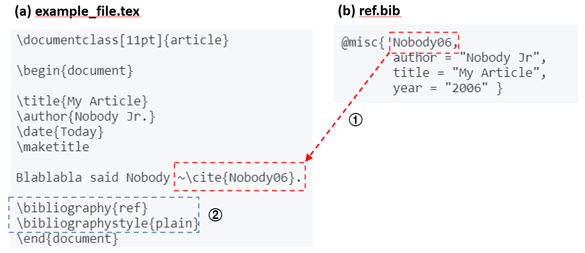 간단한 예로써, 아래처럼 example_file.tex과 ref.bib 파일이 있다고 가정하자. [3]