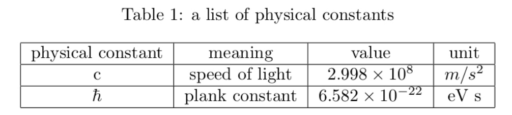 \caption{a list of physical constants}