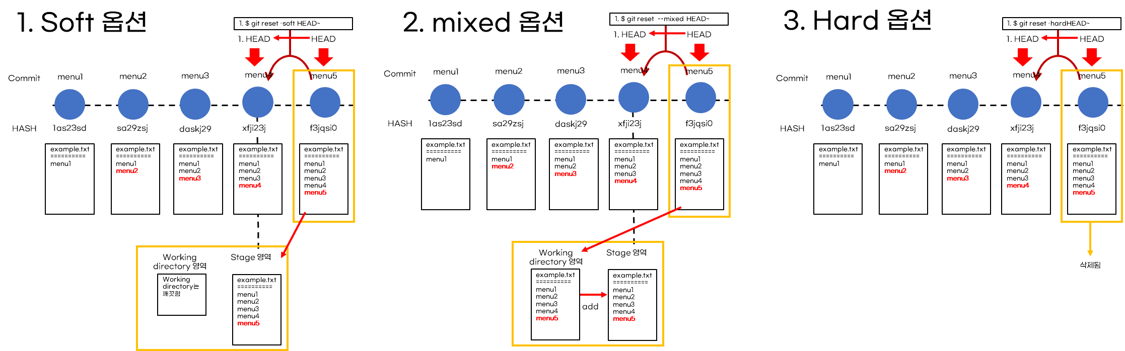 ▪ reset 명령어는 3가지 옵션 중 하나를 사용해야 함: soft, mixed, hard