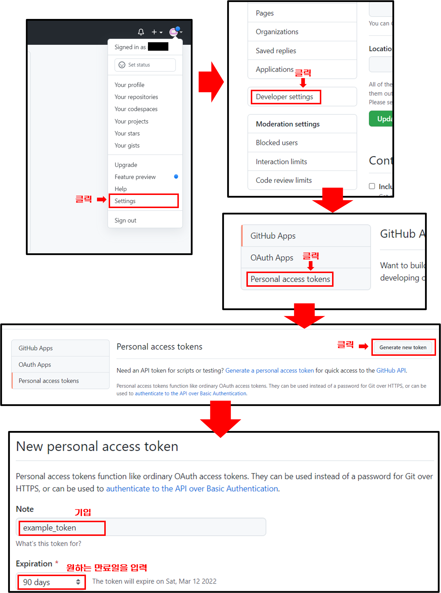 2021년 8월 13일부터 Github 측에서는 패스워드로 인증하는 것 대신에 personal access token을 이용하도록 변경을 했다. 이러한 변경 이유에는 패스워드로 인증하는 것이 해킹당할 수 있는 보안 상의 이유때문이다. 따라서 위와 같은 메시지를 받았다면, 아래와 같은 단계를 통해 토큰을 사용하는 방법으로 변경하자.
